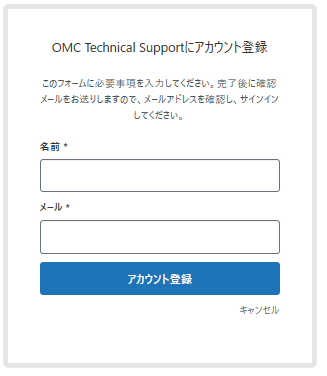 - お名前とメールアドレスを入力し、’アカウント登録’ボタンをクリックします