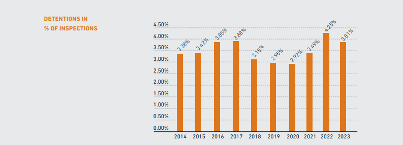 なお、イタリアにおける2023年の検船数に対する拘留割合は10.98%(1639件のInspection数に対して 180件のDetention数。Paris MOU Inspection Searchよりデータ抜粋)が記録されており、これは2023年のParis MOU管轄港の平均拘留割合3.81%と比較して著しく高くなっております。イタリア寄港の際は、特にPSCの事前準備を行うことを推奨いたします。