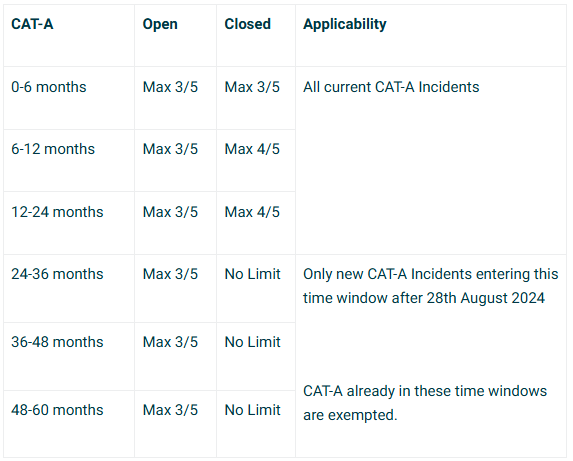 この表は、例えばCategory Aのインシデントが過去6-12か月以内に発生した場合、そのインシデントがRightShipのステータス上Openのままであれば、DOC Scoreは最大でも3、Closeされていれば最大でも4、であることを表しています。この表からは、OpenとなっているインシデントがあるとDOC Scoreが低く抑えられてしまうことがわかります。なおインシデントのCategory分けについてはこちらをご参照ください。