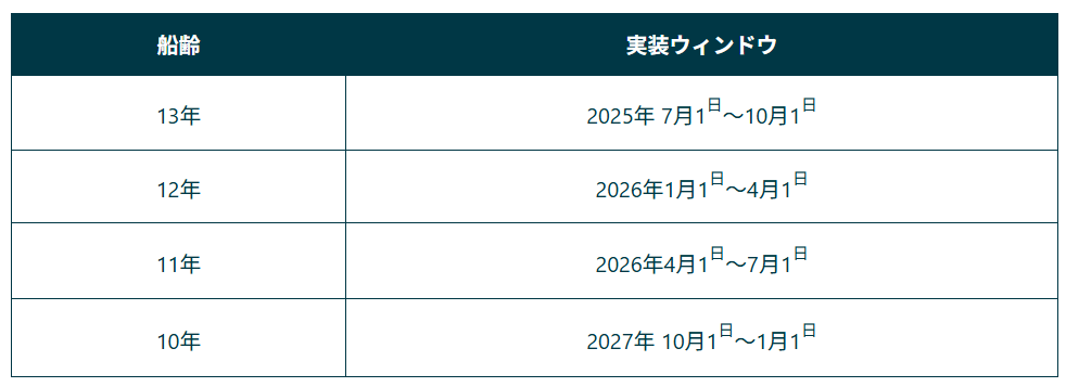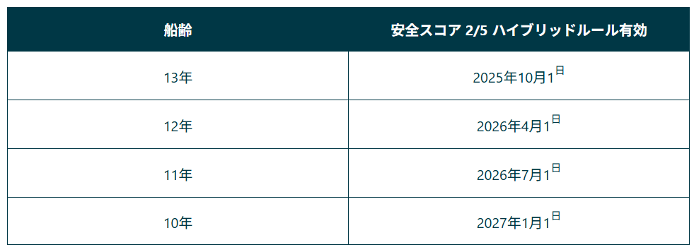 RightShipは、検査量を分散させるために3ヶ月間の実施移行期間を設けており、船舶のSafety Scoreが影響を受けないようにするためのものとなります。RightShipの審査ルールは期間開始日に更新され、船舶がRightShip審査に合格するために有効なRightShip検査が必要となる時期を示します。期間終了日は、船舶が安全スコア3/5以上を維持するために有効なRightShip検査が必要となる時期を示します。